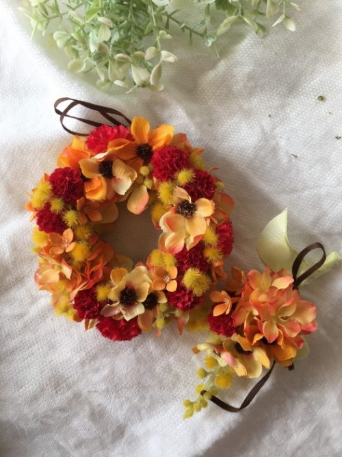 オレンジのリースは新婦のお母様へ、ブートニアは新婦のお父様へ。