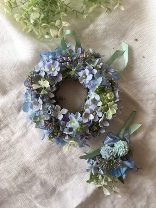 水色のリースは新郎のお母様へ、ブートニアは新郎のお父様へ。
