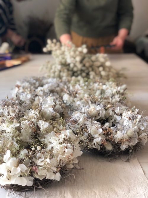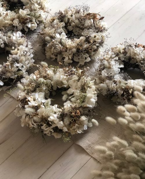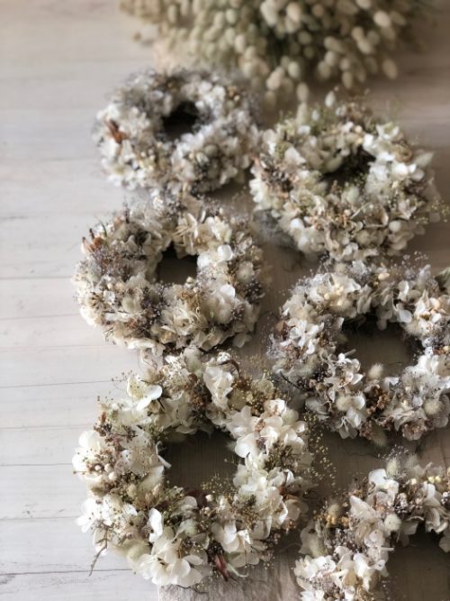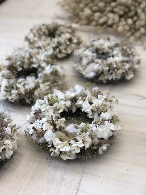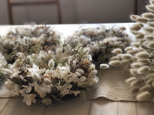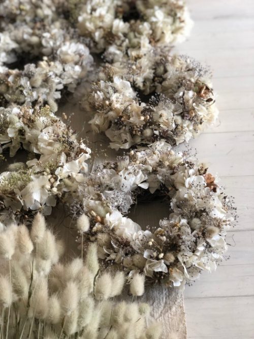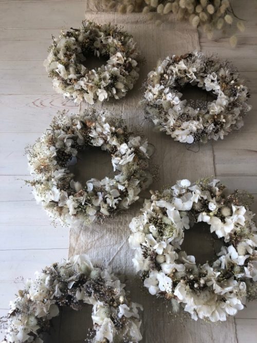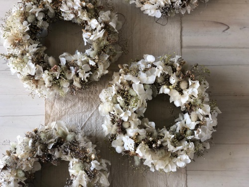 今回は、「アンティーク・ホワイト紫陽花リース」