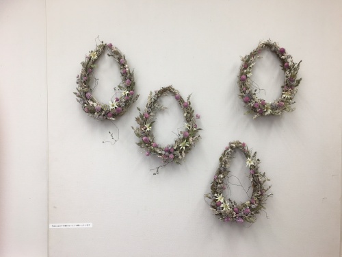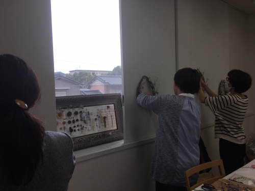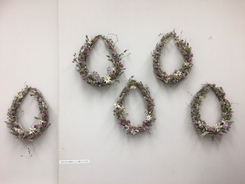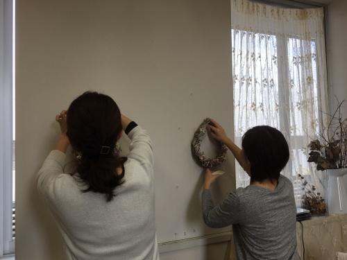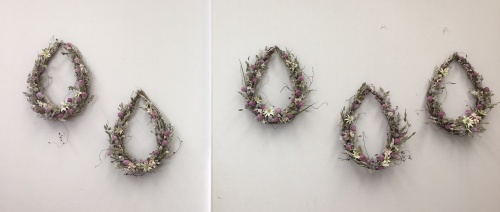 今月の涙型リース、それぞれ壁に掛けて作ります。