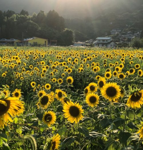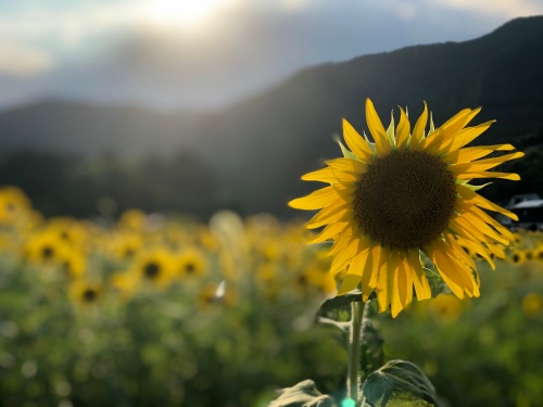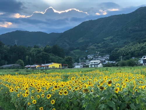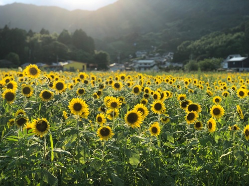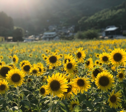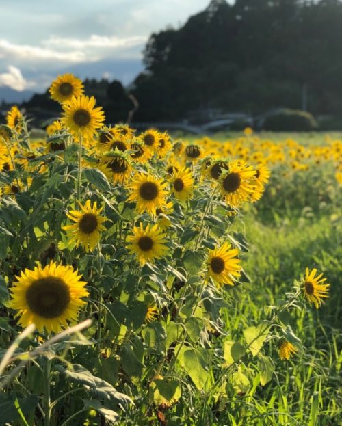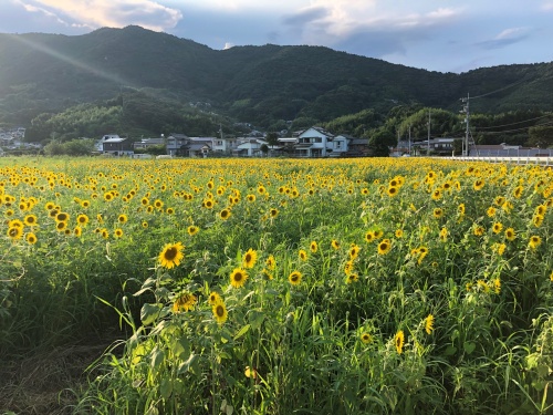 ひまわりの向こうに見える、黄色い保育園がアクセント!夕刻にいい写真が撮れましたーー«٩(*´ ꒳ `*)۶»