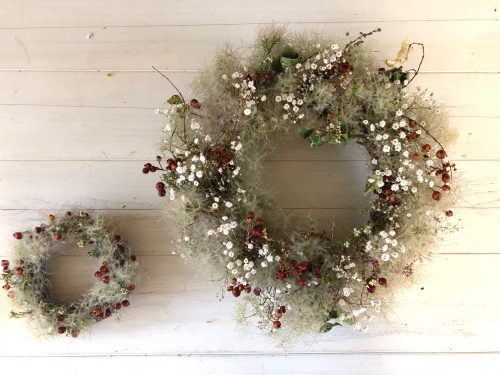 バラの実とカスミ草で、、、親子リース。