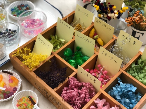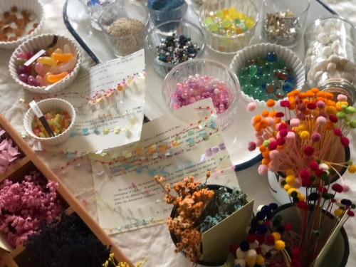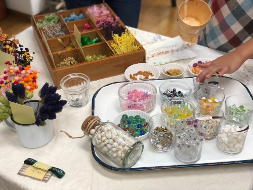 ビーズにガラス玉、ビー玉、シェル、砂、リボンに、キラキラ、ジェリービーンズ、そしてもちろんお花🌼