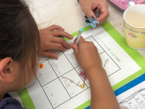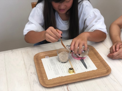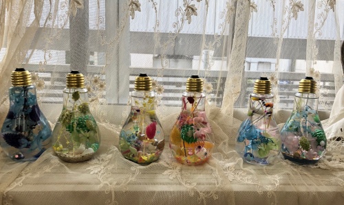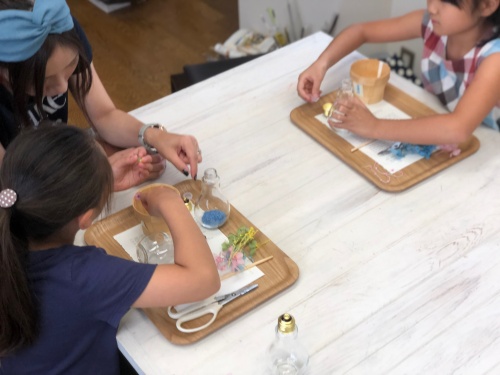どんどん、砂や花を入れていきます。去年作ったプチの形と違って電球型はサイズも大きいので少し難しいかなぁ〜
