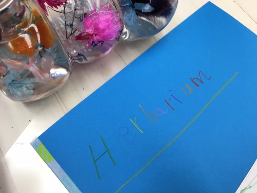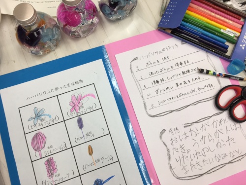 ハーバリウムについて書いたり、使ったお花の絵を描いて名前も書いたり、、、、