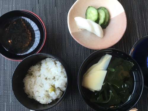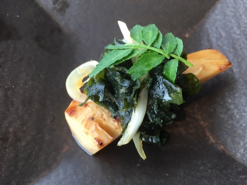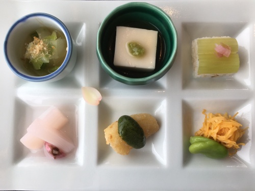 胡麻豆腐、筍雲丹和え、独活桜漬け、蕗押し寿司、新ジャガイモ田楽、ウルイ辛子浸し