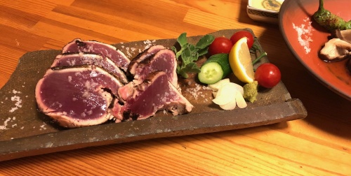 鰹塩タタキ〜まぁー、美味い、炙りたてで香ばしく、温かくほんまに高知に生まれて良かった(私は県外出身)と思う瞬間!!器は瓦ではないかなぁー?やたら重い。