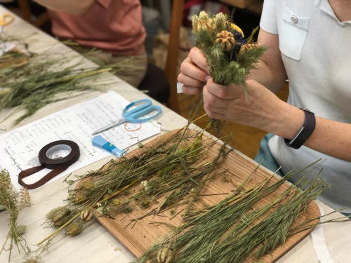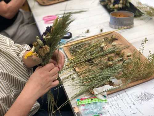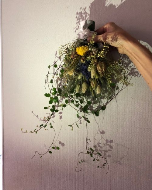 はじめ縦ラインから作っていくのでー、その過程でちょっとだけ、ほんのちょっとだけ、、、ラベンダーの紫が、、、草の緑が、、、仏花っぽく見えてしまう😢