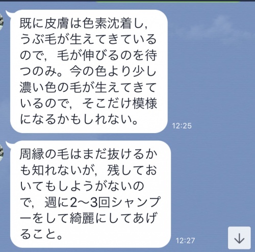 体調が悪いわけでもなく、そのハゲ部分を痒がる風もなく、、、わけが分からず 不安で落ち込む私╭︎(ಠ_ಠ٥)╮︎