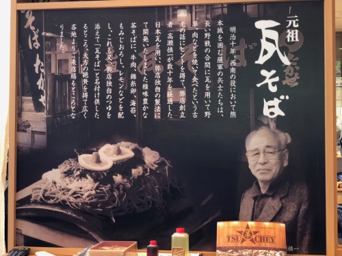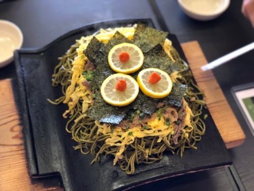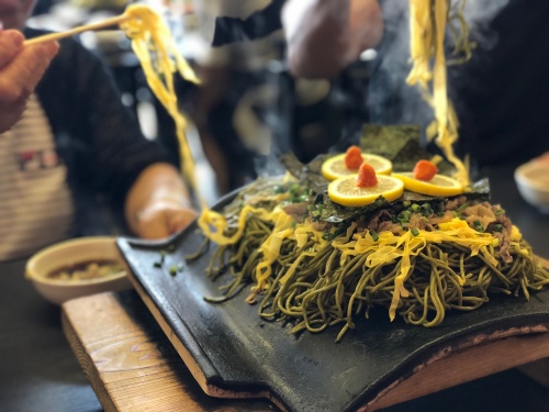 焼いた瓦の上に、茶そば、牛肉、錦糸卵、海苔、レモン、紅葉おろしってな感じ。