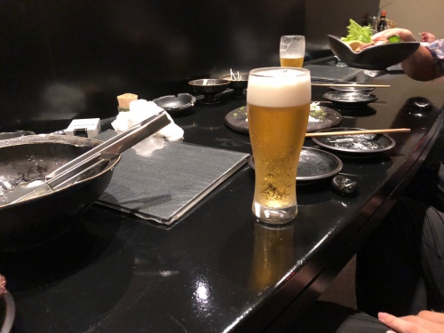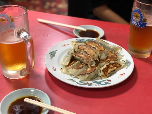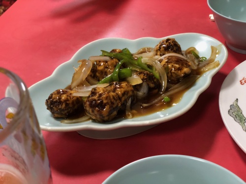 ビールに鳥の辛子炒め(撮影し忘れてる)肉団子の甘酢あん、餃子、