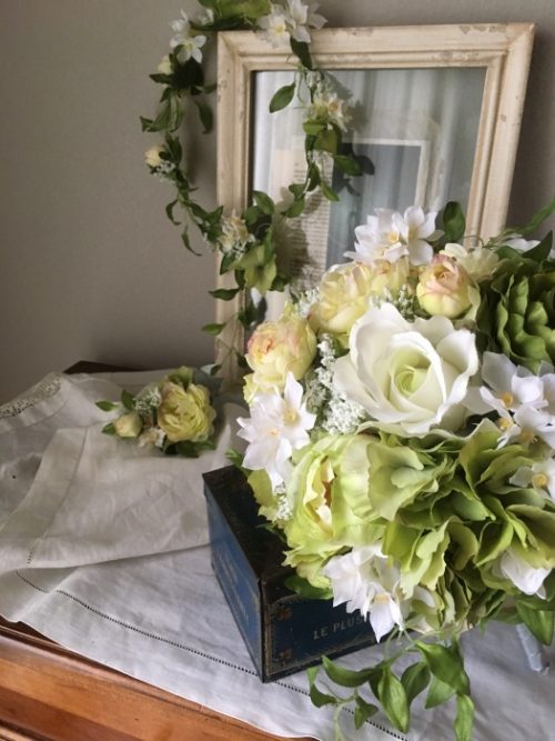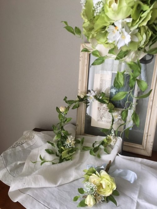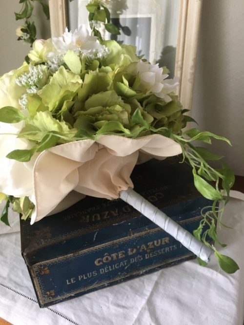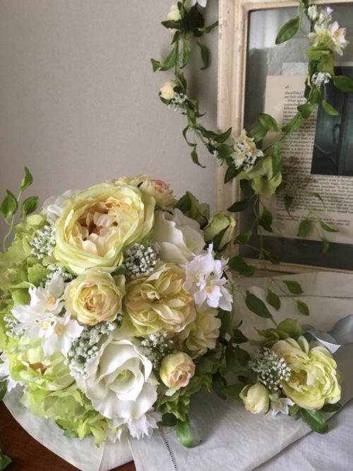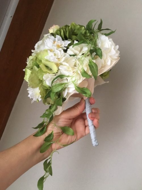 沖縄で式を挙げるということで、グリーンを入れてメリハリのあるブーケにすることにしました。