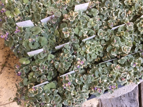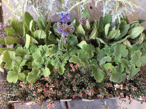 その手間、ブルーの花がボリジ、そして丸い葉っぱはペパーミントゼラニウム、手前がタイムのフォクスリーです。