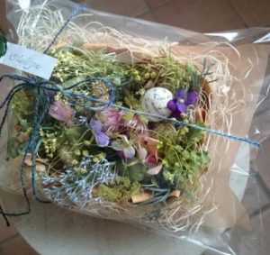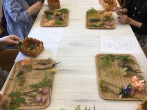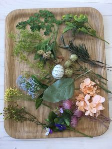 今回は、かなりの花材の量で、かわいいカゴから出るわ出るわ、どんどんでます。