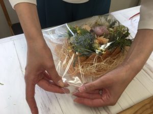 リボンは、お好みでセレクトしてもらい、thanks you メッセージと余ったアートの葉を付けて完成です。
