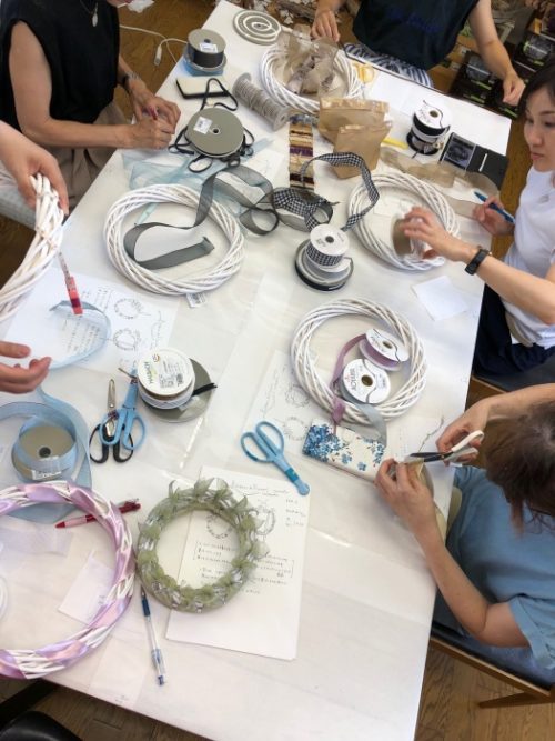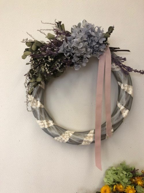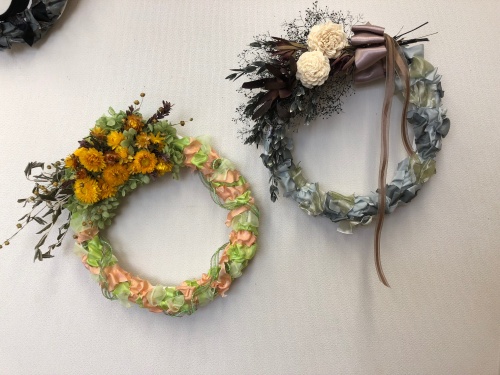 ビーズのリボンが涼やかな夏のリースとアダルトで落ち着いた作品のリースに仕上がりました。