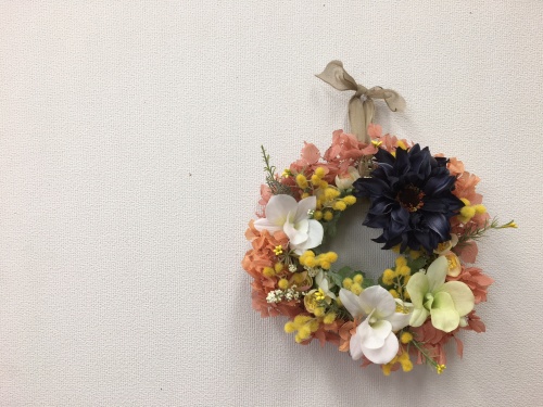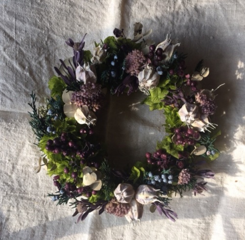 制作の最後にこの紺色の花を入れたことで 彼女らしいリースになりました。