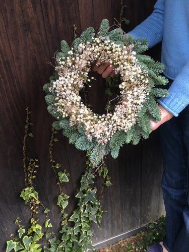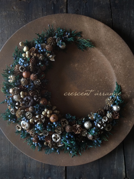 去年は、シックに実ものを使い、その前は シルバーモミとプリザーブドの三種のかすみ草でオーバルリースだったような〜?