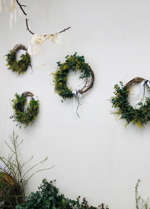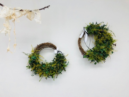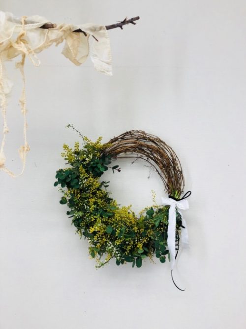 花材は、ミモザ、グニユーカリ、雪柳 全てフレッシュ花材です。