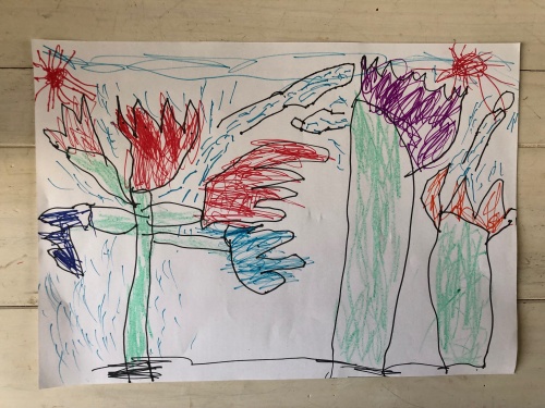 5歳の女の子から お花の絵のプレゼントです。チューリップ🌷とヒヤシンス、春のお花がかわいく描けていますねー