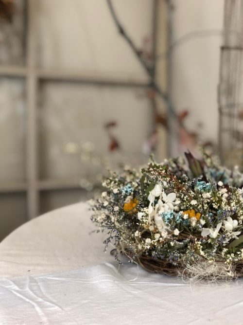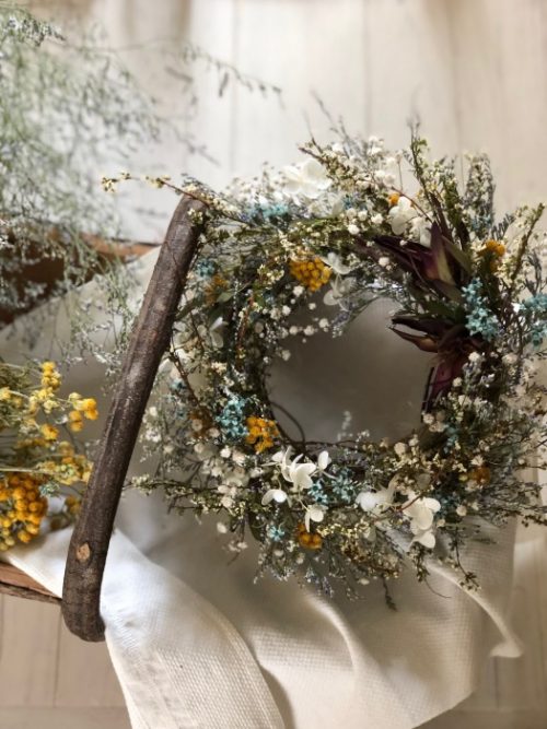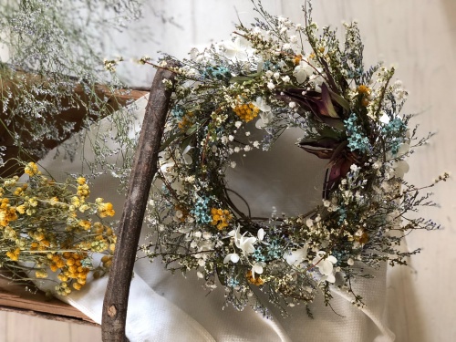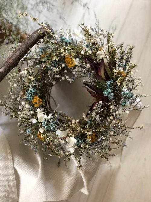 花と花の間に、すーっと初夏の風が通る爽やかリースを目指して!!