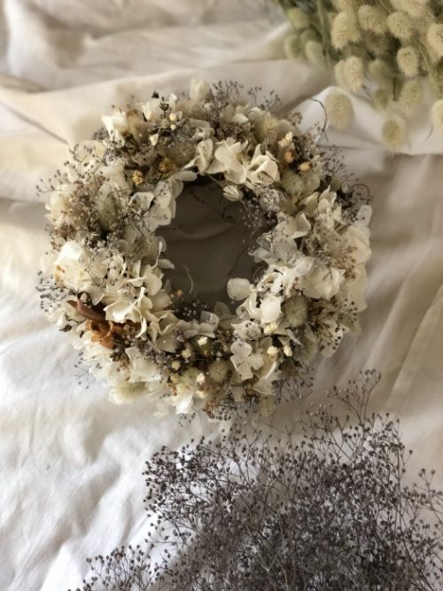 この花材達をみんなに渡して、各々の感性で 同じ花材でも個性溢れるリースが出来上がる。