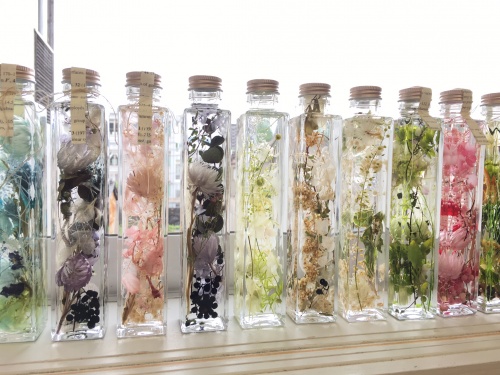 リースとは違って、花びら、葉っぱ一枚が生かせたり、リースなら埋もれてしまいそうな花がハーバリウムならボトルの中で輝きます。