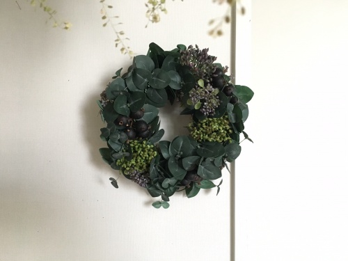 湿気や日差しでナチュラルリースは傷みやすいので、久しぶりのアーティシャルフラワーの登場です。