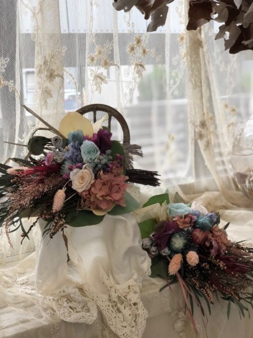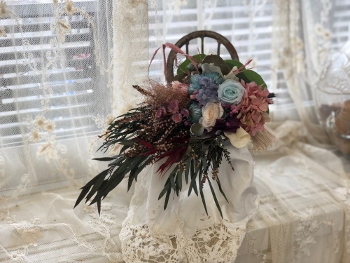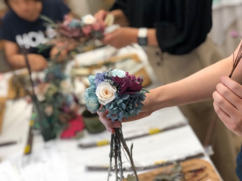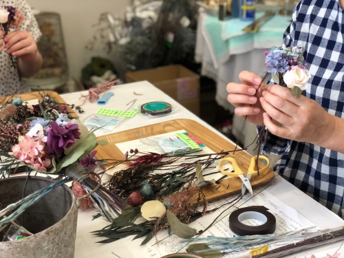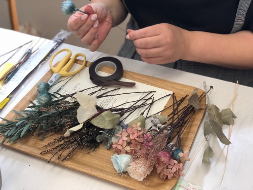 全ての花材をワイヤーリングしてテーピングするのが一番キレイに出来上がると言う話をすると、、、