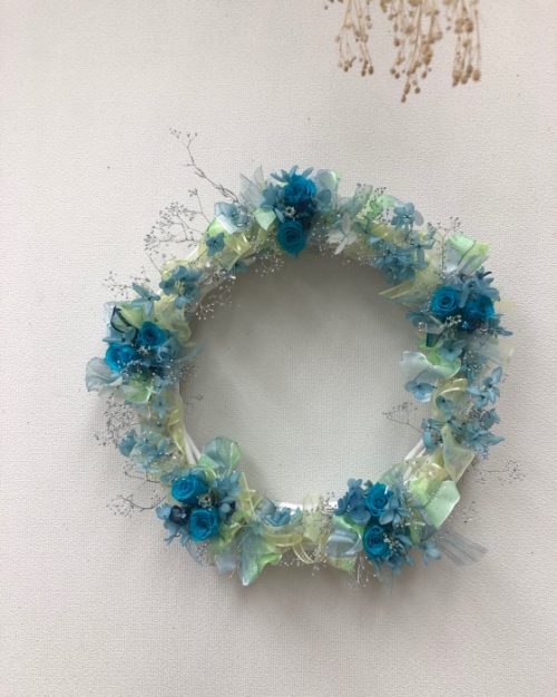 キレイな色のブルーのバラと黄色いリボンのコントラストは彼女そのものですね。