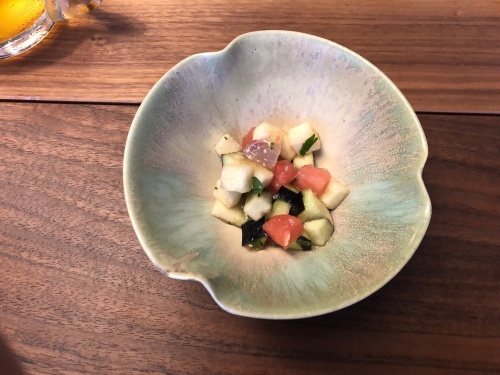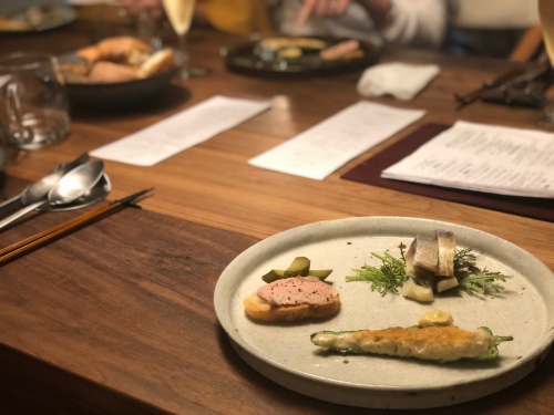〆サバとポテトサラダ、レバームース、ハモと万願寺とうがらしのソテー