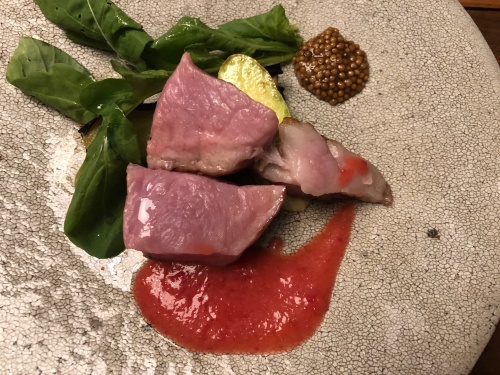 ナイフを入れると中々 切れない╭︎(ಠ_ಠ٥)╮︎ 噛み切れないのかと思いきや、口の中では さらりと柔らかく入っていくΣ(゚ロ゚;) なんとも 初食感のお肉ちゃんでした。どうなってるんだろー?