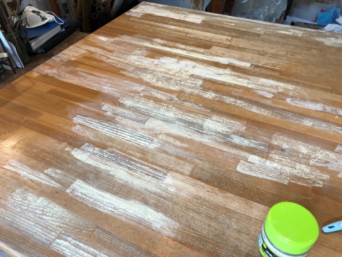 ローラーで塗っていきます!カウンター両サイドのみ木の模様が面白いので、残します。