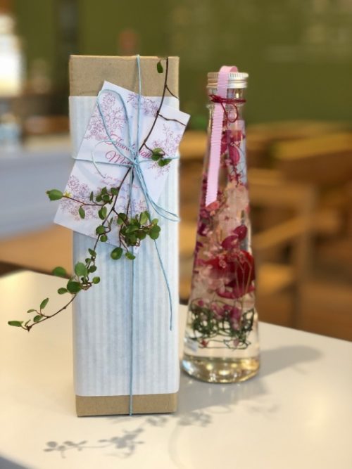 専用ボックスに入れ、ペーパーで巻き クロスリボンをして、カードとワイヤープランツを付けて完成です。
