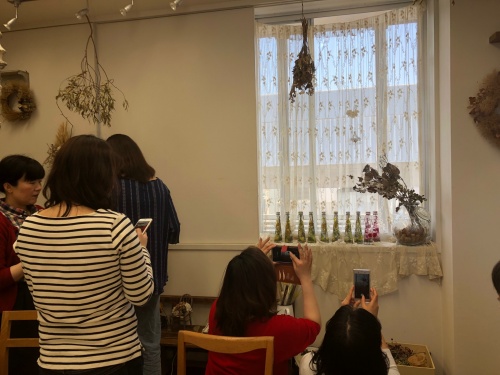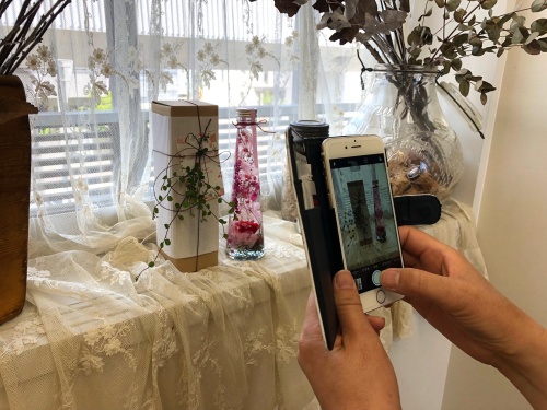 それぞれ、思い思いに花を入れ、私がオイルを入れ、リボンを付けたところで撮影タイムです。