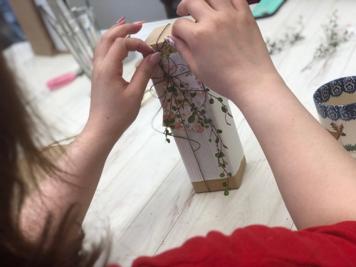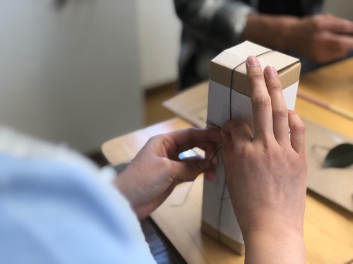 ペーパー巻いて、クロスリボン、皆さん頑張ってリボンを自力でやってました。