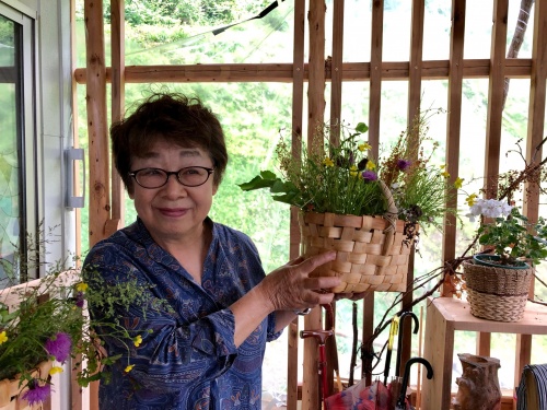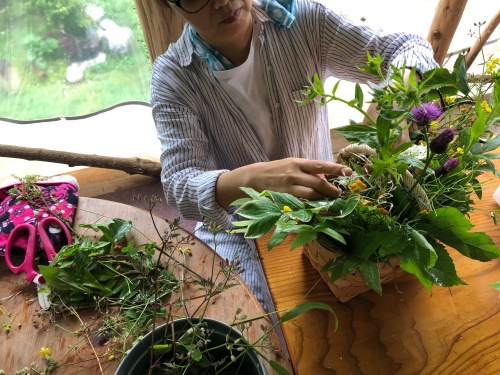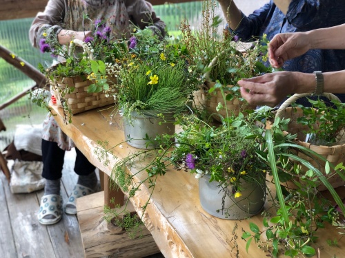 テラスで、可愛い😍花籠に生けていきます😀