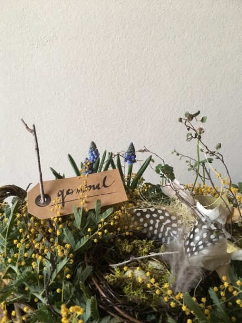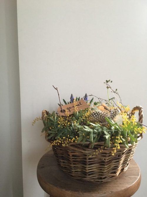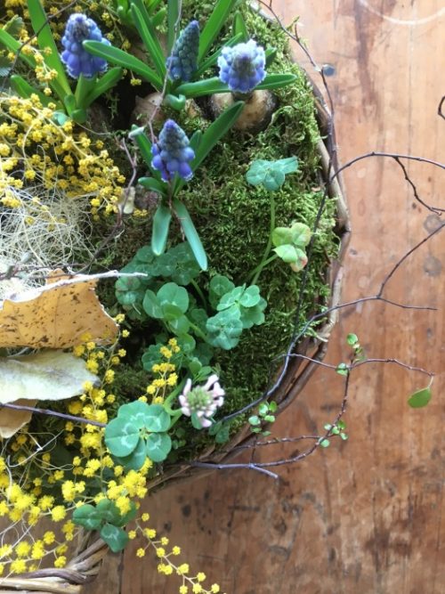 ムスカリとクローバーの苗を使ったバスケットアレンジです。