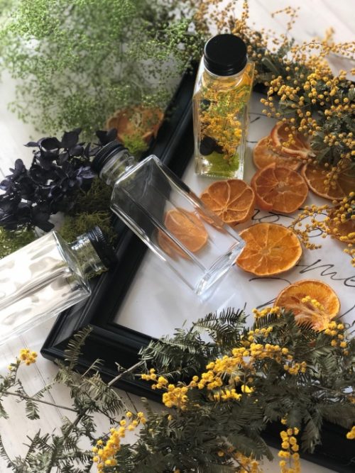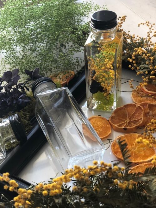 ボトルは、100mlのスクエアミニボトル(高さ12,5㎝ 幅4㎝)、ブラックキャップをお一人様3本作ります。