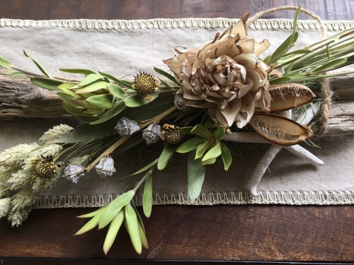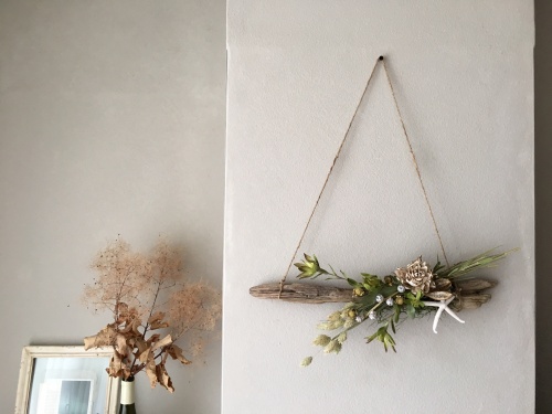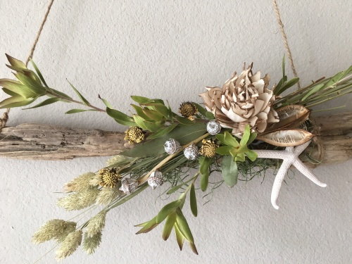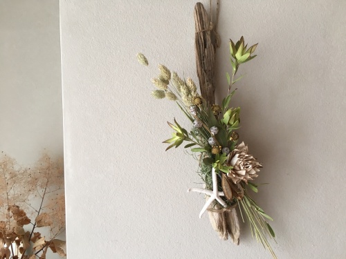 麻紐で持ち手を付け、ヒトデやネイティブフラワーをあしらった、今からの季節にぴったりのアレンジです。