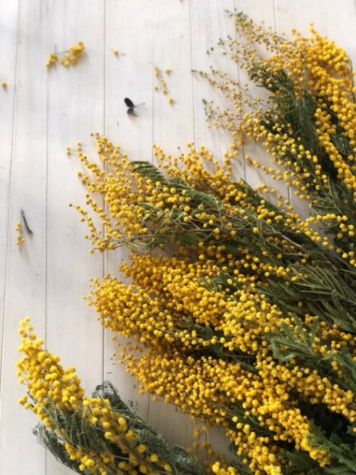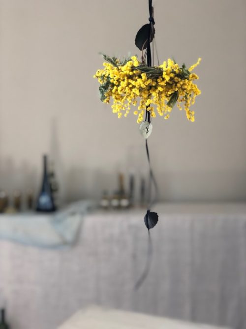 本体はイタリア産ミモザのみ、 リーフと黒のベルベットリボンでシックに仕上げたミニフライングリースです。リースベースは12センチ位です。
