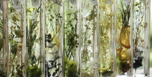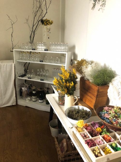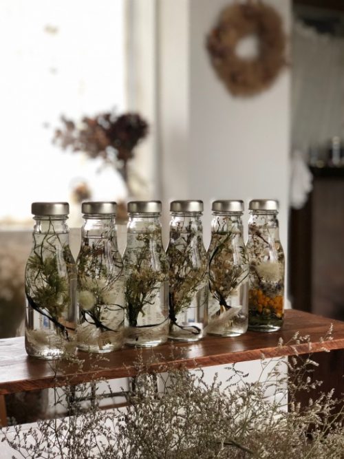 ふわふわした花材やもふもふした花材を、ハーバリウムの中に閉じ込めて、アンティーク感満載のオリジナル作品を作ります。