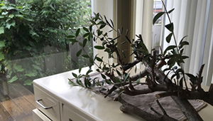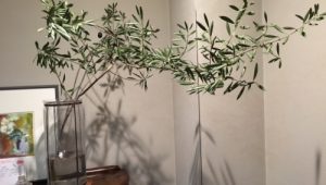 庭のオリーブの枝。 普通なら葉を花瓶に入れて飾るところですが、こんな飾り方も、意外に素敵です。…