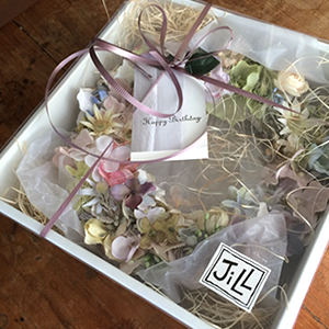 お部屋の雰囲気にあわせたリースを飾りたい、ご家族、お友達、大切な人への記念日に贈りたいなど、ご予算やご要望をお聞きしながら、花材ひとつひとつに想いを込めてオリジナルリースをお作ります。 また、ギフト用にはジルならではのラッピングも無料で承っております。